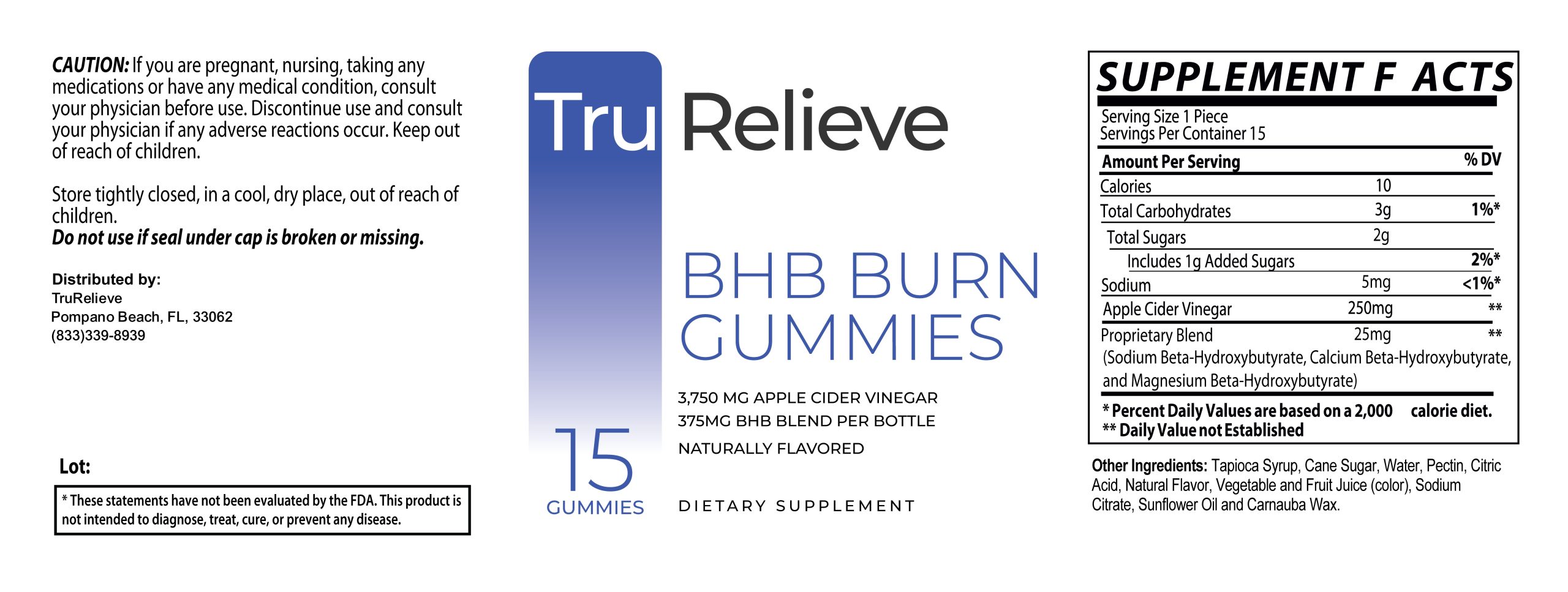 Our premium TruRelieve BHB Burn Gummies support your body’s natural ability to burn fat for energy, helping you stay on track with your wellness goals. Crafted with high-quality, bioavailable BHB for effective daily support in a convenient, great-tasting gummy.